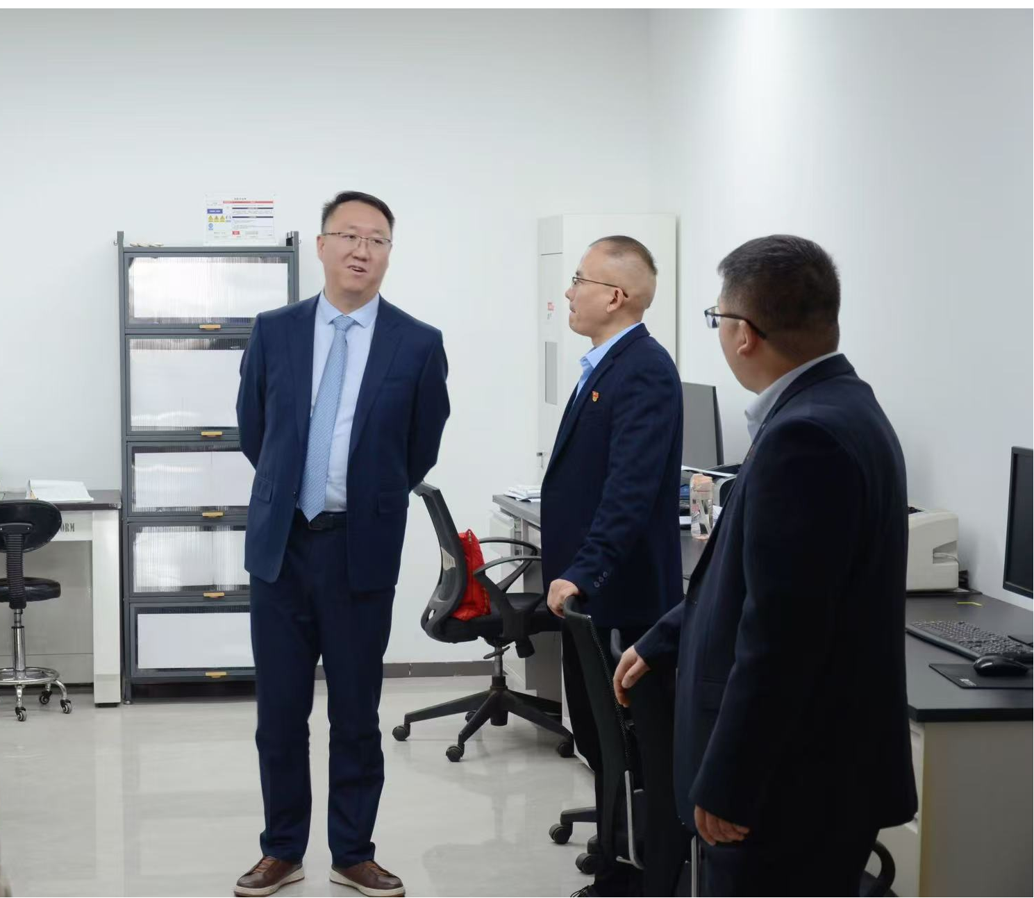 闫宁一行深入实验室现场,对实验室的设备运行状况、危险化学品的存储与使用、气瓶间的管理、消防设施的配备以及安全制度的落实等方面展开了重点检查。每至一处,皆认真查看,详细询问,并与实验室工作人员深入交流,全面了解员工在日常工作中对安全问题的认知程度和处理措施。