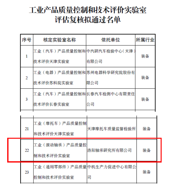 轴研所通过工业(滚动轴承)产品质量控制和技术评价实验室复核